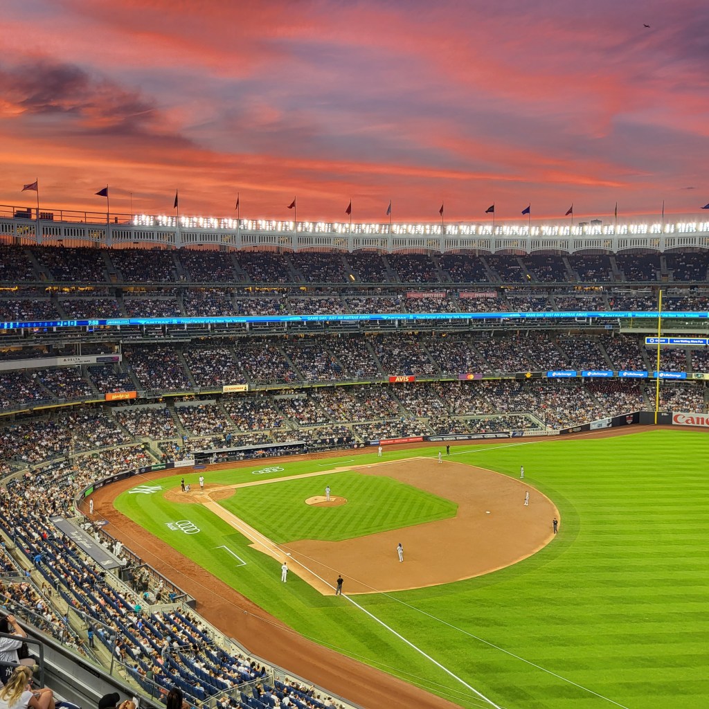 Yankee Stadium resplendent under a New York City sunset.
