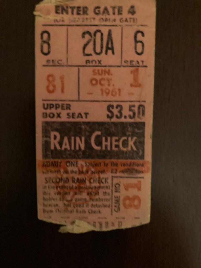 This historic event has specific meaning for me. As a nine-year-old I was fortunate enough to attend the game in 1961 where Maris hit his 61st. Pictured above is the ticket stub from that game that my brother saved. Back then our dad made it his mission to take us to at least one Yankee game every year. The trek over to Yankee Stadium from New Jersey wasn’t always an easy one especially for my dad who worked in construction and the summer and early fall were extremely busy for him. But we made it to that game. The last game of the 1961 season. And it will forever be etched in our memories.